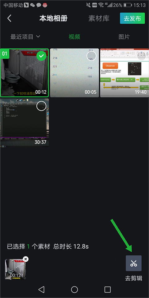 3、选择手机里的本地视频,点击页面右上角的【去发布】将视频上传,在上传之前,也可点击页面右下角的【去剪辑】(下图绿色箭头所指区域)对视频进行处理