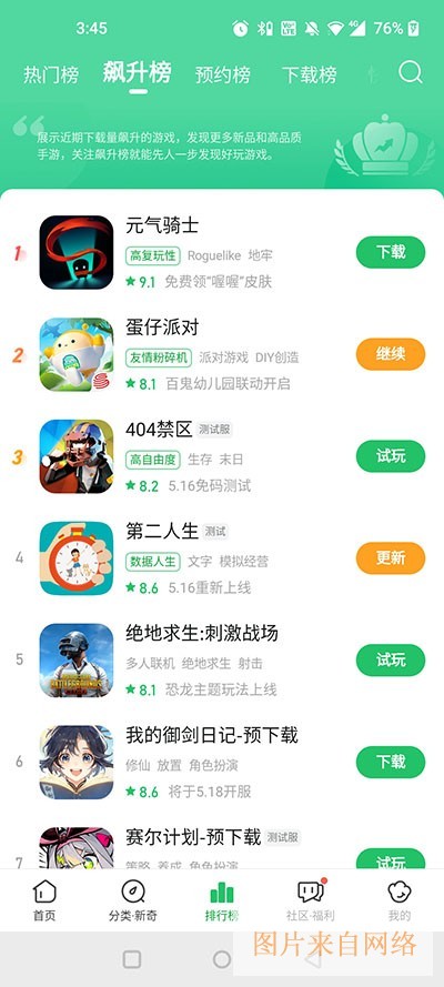 2、下方有【排行榜】选项,点击后能看到最近高品质、好玩的热门游戏,方便用户快速找到感兴趣的内容。