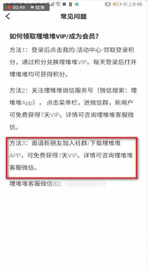 方法3:邀请新朋友加入社群/下载埋堆堆app,可免费获得7天VIP。