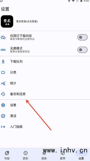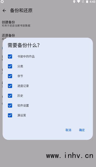 4、点击创建备份后,还能选择备份的作品类型,章节、历史、分类、源设置等等