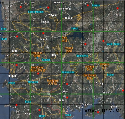 红色地点为军事基地,蓝色是设计有警察局的城镇,黄色区域为重要建筑群,白色则代表普通小镇。