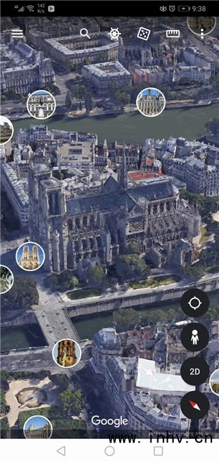 4、当我们切换2D/3D模式 3D模式可以进入观看360°全景照片 点击圆圈图片可以进入观看全世界Google地球用户上传的实景照片;