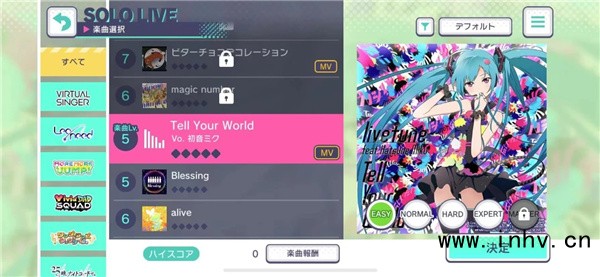 4、游戏有3种不同的音符,包括单点(TAP)、滑键(FLICK)、长按(HOLD)。值得一提的是,游戏内的某些歌曲还会分成「原曲ver.」(虚拟歌手ver.),与由虚拟歌手与游戏原创角色共同演唱的「世界ver.」供玩家选择,而歌曲难度也从最简单的Easy到最上级的Master共分为五个阶段,让玩家能自由选择适合自己的难度游玩。