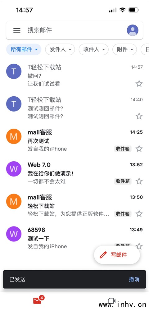 当邮件发送成功后底部会提示“已发送”,我们点击已发送后面的“撤销”按钮即可