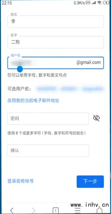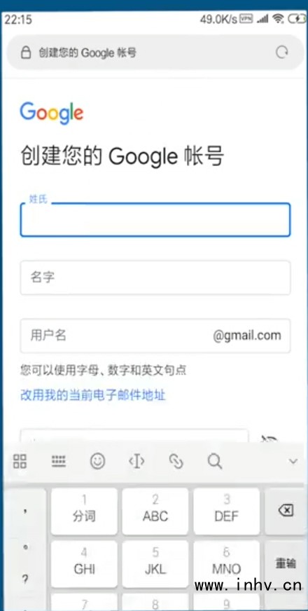 进入创建账号页面,按照页面提示依次输入姓氏、名字和自己设置一个邮箱地址名字