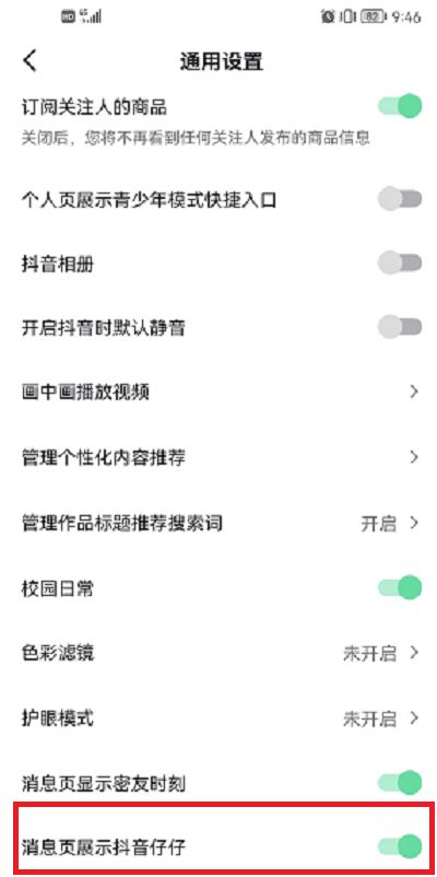 4、在此功能界面,点击关闭【消息页展示抖音仔仔】功能即可取消仔仔。