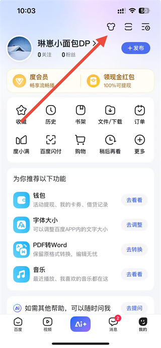 1、打开百度应用,点击右上角的功能菜单按钮。