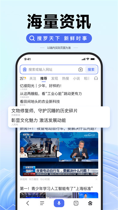 根据你的兴趣,颠覆传统-人“搜索”信息模式全新信息流,只需下拉刷新,最新最全的热点资讯第一时间掌握,足不出户尽享世间精彩,24小时刷不停,让每分每秒的生活都淋漓尽致。
