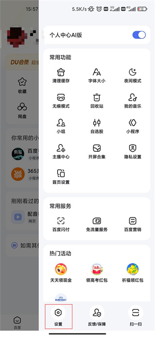 1、打开手机上的百度APP,依次点选【我的】-【设置】