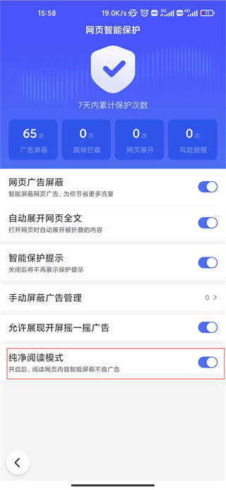 4、勾选【纯净阅读模式】,开启后,阅读网页内容智能屏蔽不良广告