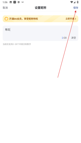 4、在设置昵称页面的输入框中输入新的昵称,点击保存按钮。