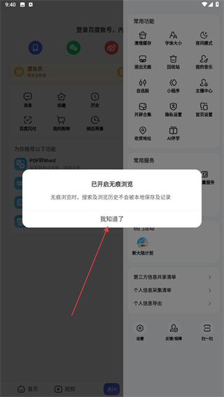 4、点击后,会直接开启无痕浏览,再次点击我知道了即可。