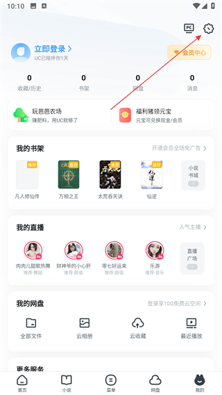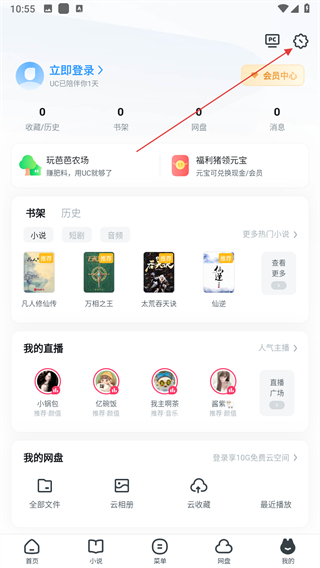 1、打开uc浏览器进入我的页面,找到右上角的设置图标并点击进入更多设置界面。