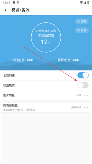 4、在极速/省流设置页面找到极速模式选项,点击其右侧的开关按钮。