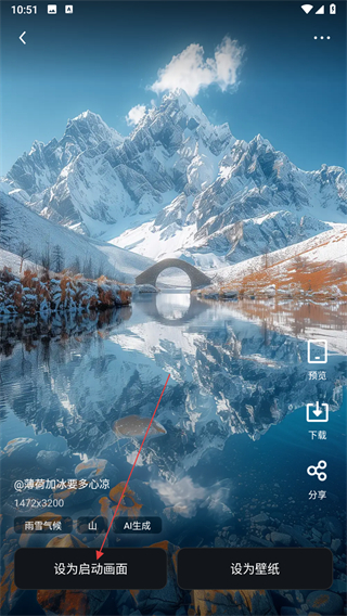 4、在壁纸详情界面找到设为启动画面按钮,点击该按钮即可完成启动画面设置。
