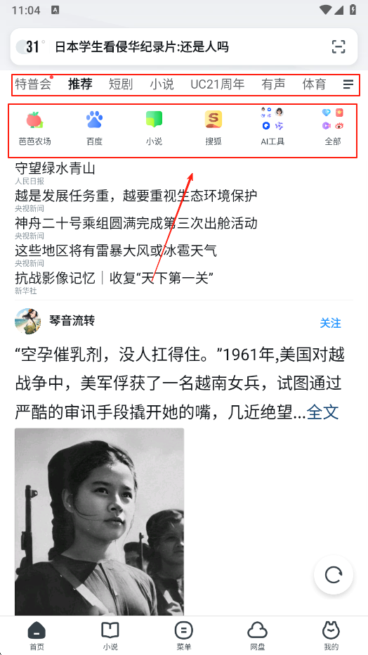 1、打开浏览器,在首页可看到各类推荐内容,上方有特普会,推荐等板块,还有芭芭农场,百度等快捷入口,点击相应板块或入口,可浏览对应内容。