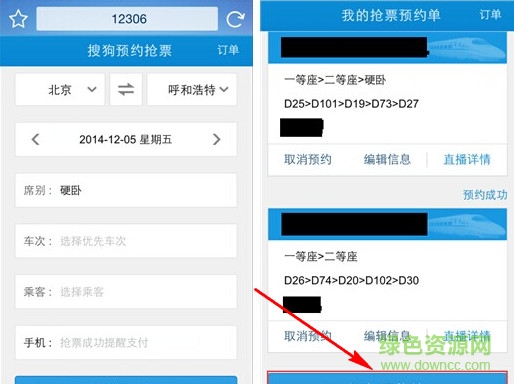 登陆界面点击“预约抢票”就可开始我们的“约票”之旅了,进入后就可以根据自己的出行需要选择火车的起始点、时间、席别、车次、乘车人等相关信息,最后填写上自己的电话号码点击“提交预约单”,整个“约票”操作就正式结束了。剩下的就是搜狗手机浏览器在当次火车票开售时,全自动并且可以7*24小时离线为用户抢票。一旦抢购成功,会再次以短信的方式通知你,你只需负责最后的支付环节就好。