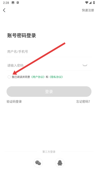 3、在进入到登录页面时,先需要点击勾选我已阅读并同意按钮后进行操作。