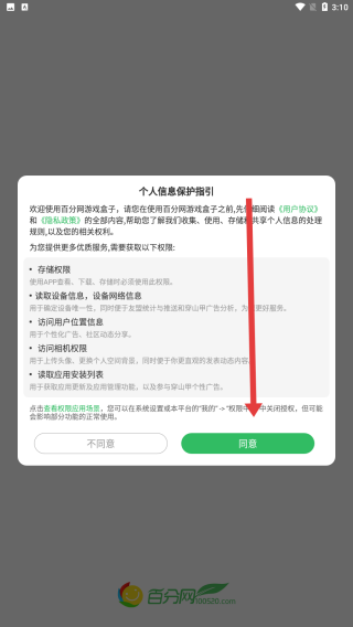 1、打开应用时,需阅读并点击同意个人信息保护指引,方可进入游戏平台主界面,开启游戏查找与体验流程。