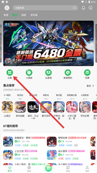 2、进入游戏平台主界面后,点击分类按钮,进入游戏分类页面,可浏览重点推荐、BT福利推荐等多样游戏板块。