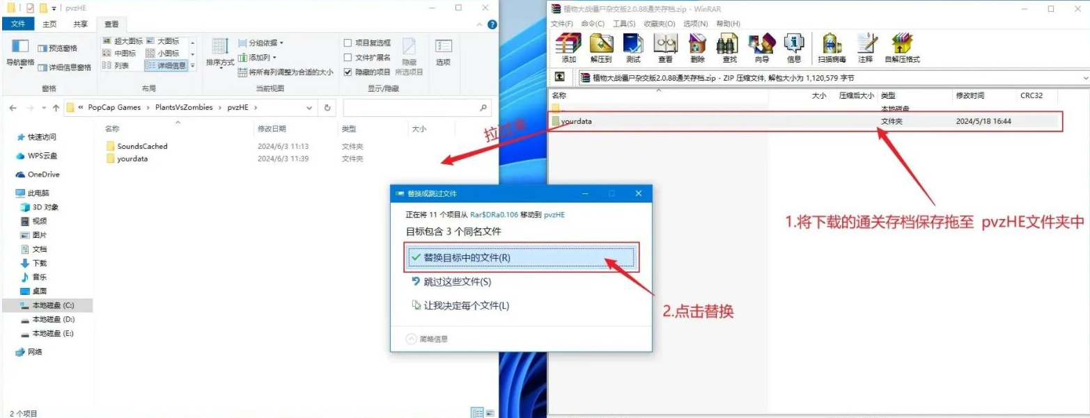 5、将下载保存/下载的存档拉进pvzHE文件夹中,点击替换就导入了,如果前面的存档想要保存一份,可以先备份一下。