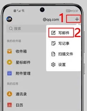 2、在已登录QQ邮箱账号的App主界面点击屏幕右上角的加号,并在弹出的菜单中点击“写邮件”。