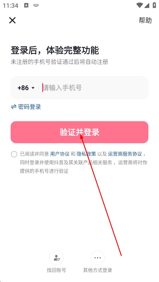 3、完成授权后,回到抖音登录页,输入手机号码,勾选同意协议,点击验证并登录,完成账号登录流程 。