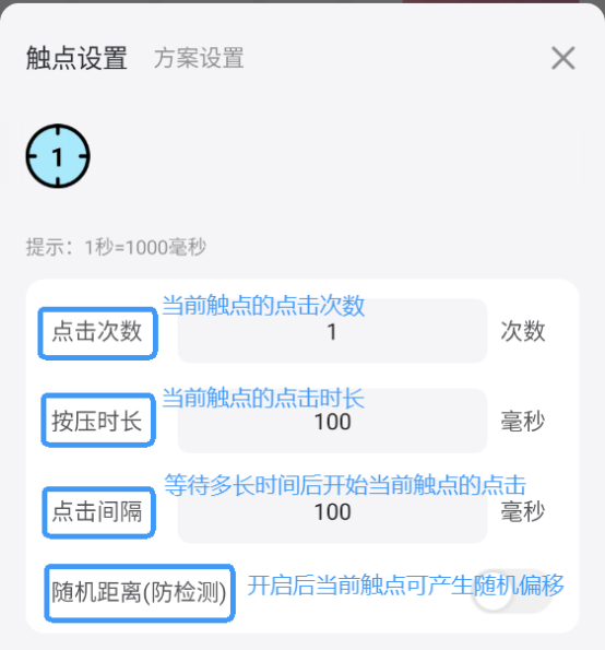 1秒=1000毫秒,建议时长设置不低于10毫秒,以免点击速度太快造成应用崩溃