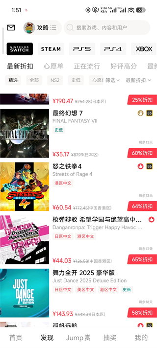 Jump 提供全平台(Switch、Steam、Xbox、PlayStation、手机)的游戏信息,以及全区服的游戏价格和折扣/史低信息,并会每日为玩家提供包含了最值得关注的游戏的折扣速报。