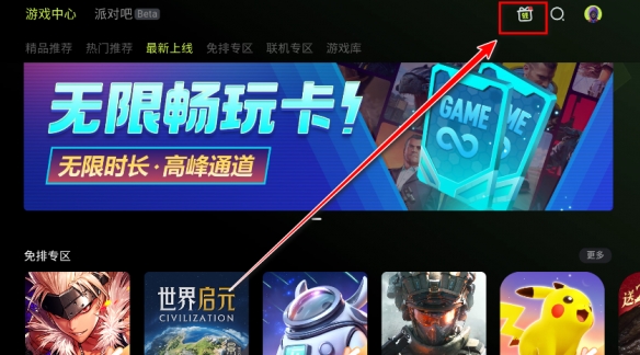 1、打开3A云游,点击箭头所指的礼包图标。