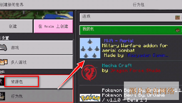 若只想在单个地图内使用,在地图的设置菜单内找到资源包选项卡,激活即可;而附加包需要把行为包和资源包都激活,并且大部分附加包都是需要开启实验玩法才可以正常使用的。