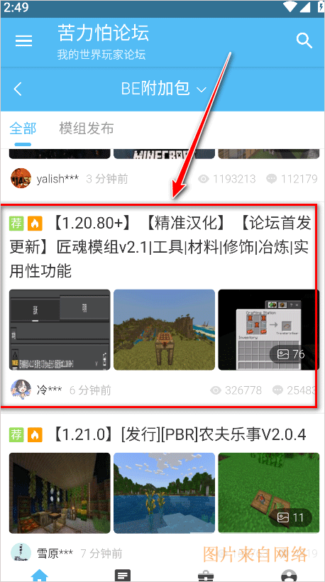 1、打开苦力怕论坛,点击模组。