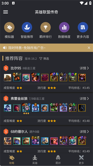 2、进入【攻略板块】可看到版本热门S级阵容推荐,能查看成型难度、流行度等信息,点击【详情】看具体搭配。