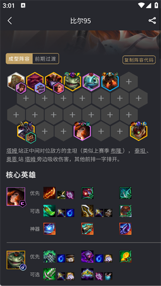 3、阵容详情页会展示成型阵容的站位、核心英雄的装备优先级,还能复制阵容代码直接用。