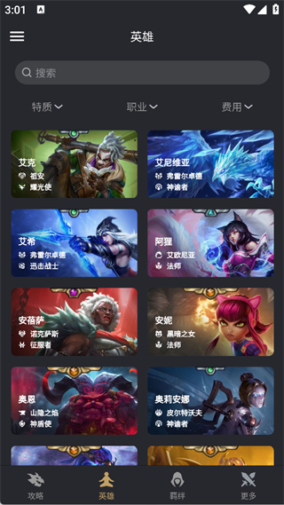 4、在【英雄板块】可按特质、职业、费用筛选英雄,快速查看每个英雄的属性与羁绊标签。
