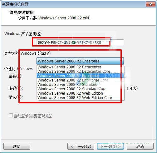6、输入win2008 r2安装密钥【BHXYW-P9HCT-2VBWG-VF9K7-KKRK8】,并选择好需要安装的版本,这里小编当然选择企业版【windows server 2008 r2 enterprise】,全名和密码可以自行设置,这里小编不设定直接下一步;