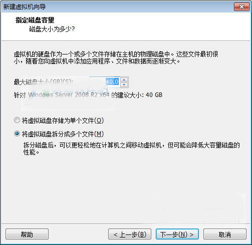 8、一般来说,windows2008 r2的系统占用空间约为20G左右,但实际安装建议50G以上,由于这里是虚拟机安装测试,就采用默认的40G就行。另外一个选项就设置为【将虚拟磁盘拆分成多个文件】