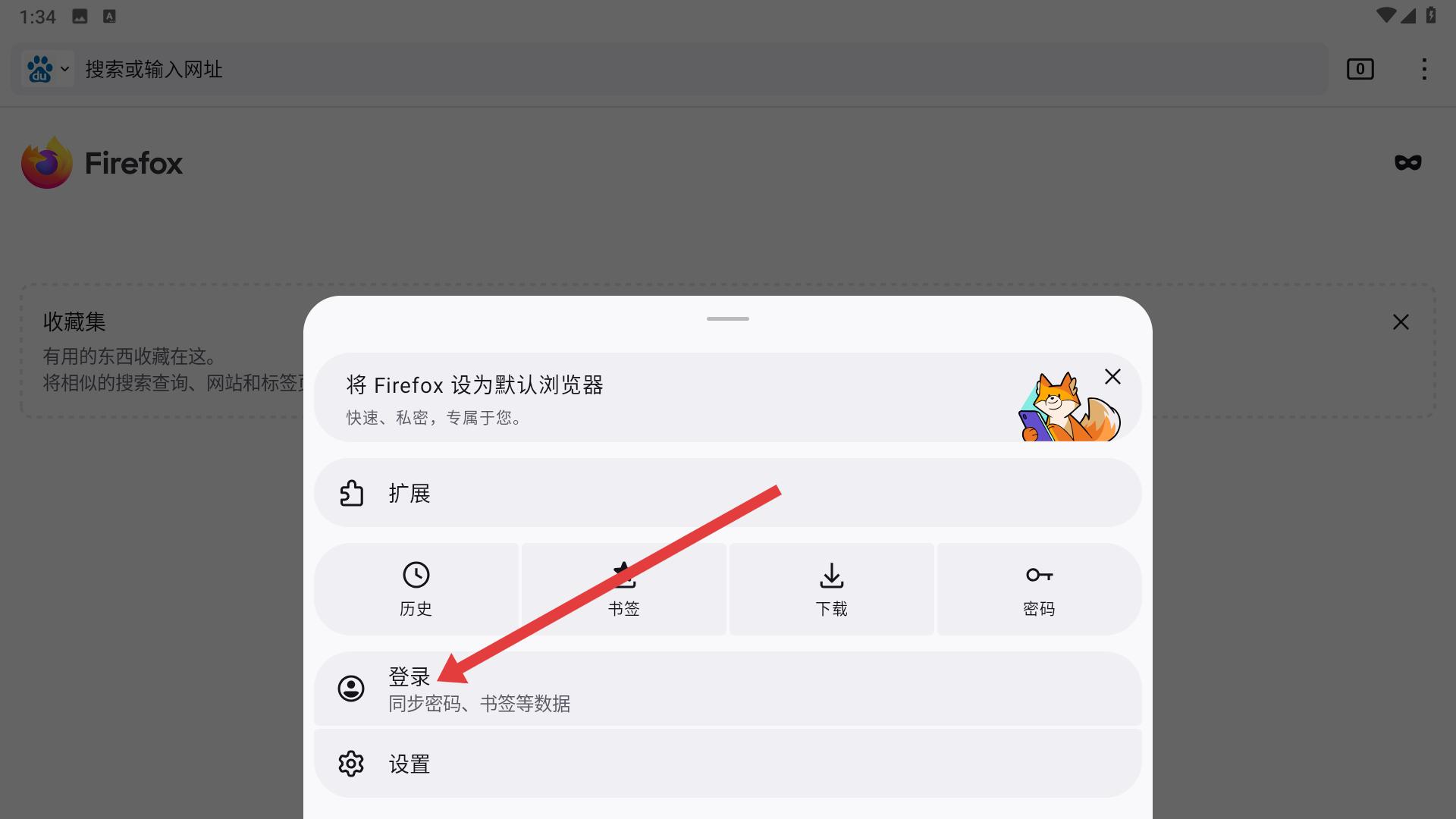 2、弹出的菜单中,找到登录选项并点击,该选项可实现密码、书签等数据的同步。