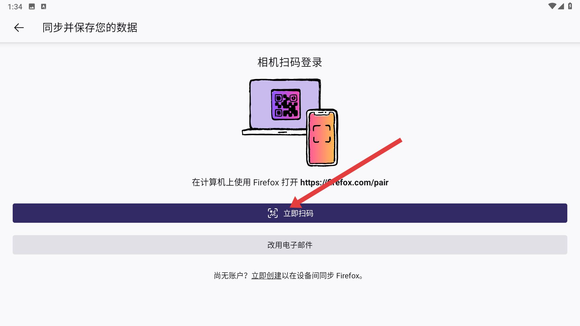 3、进入同步界面后,选择立即扫码按钮,通过相机扫码的方式来进行登录操作。