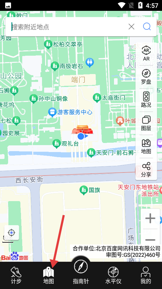 2、地图功能页面可搜索附近地点,以北京区域为例,标注诸多景点与设施,由百度网讯科技合作支持。