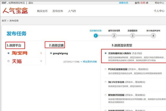 第一步:如下图:点击【发布任务】,进入发布任务页面点击【选择平台】(淘宝、天猫);也可通过【个人中心】,点击 【发布任务】