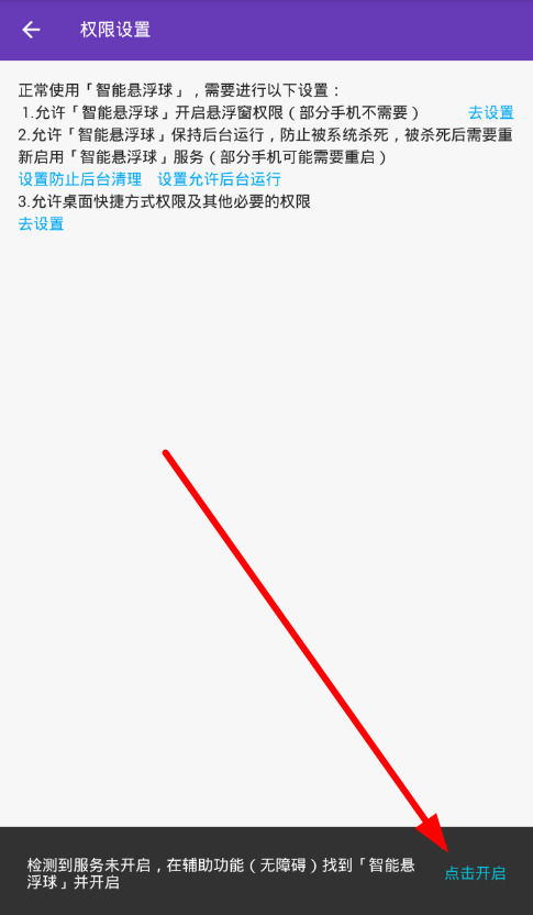 3、在这之后,用户需要通过点击下方的“点击开启”按钮,只有打开了悬浮窗权限才能使用智能悬浮球功能,让用户体验自己设置的快捷操作。