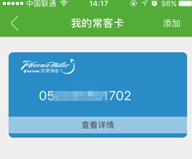 5.下图就是添加成功之后的常客卡的信息,点击相应的常客卡就可以查看相应的信息。