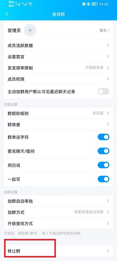 4、随后就可以在该功能界面中最下方看到【转让群】;