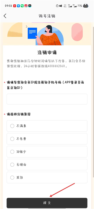 4、填写会员ID或手机号码,选择注销原因,最后点击提交。