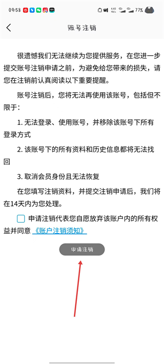3、勾选《账户注销须知》,然后点击申请注销按钮。