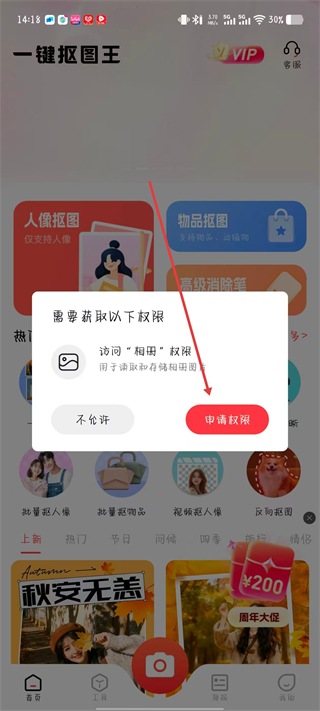 2、弹出权限申请框后点击申请权限,获取访问相册权限。