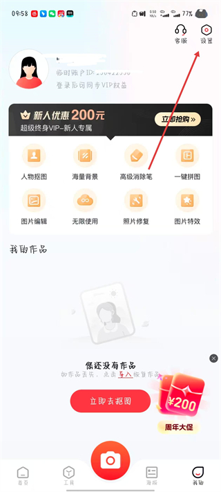 1、打开一键抠图app,在我的页面,点击设置图标。